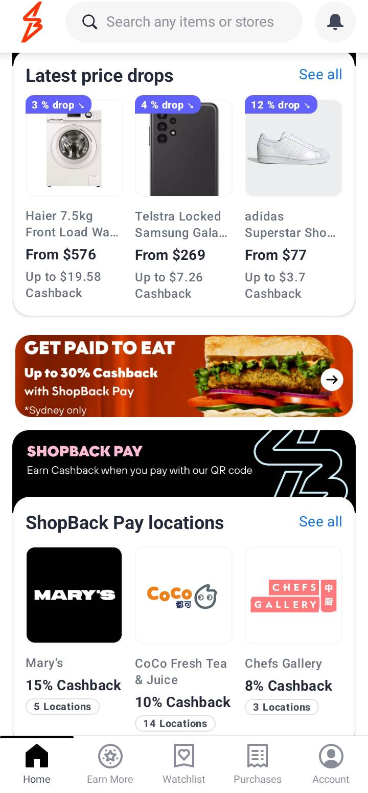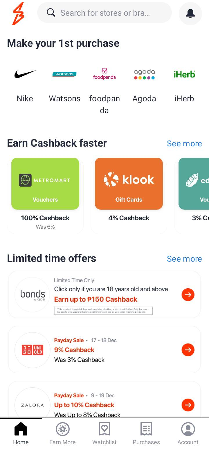 ShopBack - Shop, Earn & Pay offers a cashback feature with every item you purchase from a store via the app. You can use the search bar to look for your favorite stores or brands and then you can browse the deals they can offer you. Each entry will have the item that you are buying, the price, a note if you can earn some cashback points, the model, and which store it's available in. There are also additional deals like free shipping or promos that you can avail of depending on their current offers. You can then add the store to your Watchlist and easily find them by just going to its tab.